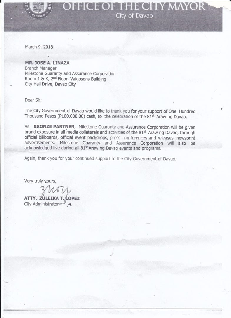 As BRONZE PARTNER, Milestone Guaranty and assurance Corporation will be given brand exposure in all media collaterals and activities of the 81st Araw nang Davao.